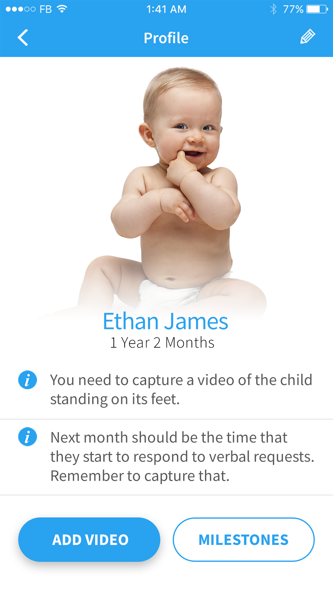 But now, the Childstones app changes all of that. The app will organize and store these short diagnostic videos, which are easily made accessible to a healthcare professional who may need to go back in time and study the child's progression in speech, physical or social skills. Any deviation from normal development will be preserved on footage. By having a diagnostic video collection taken over time, a professional will have the complete milestone developmental history that can be studied and used for diagnosis.