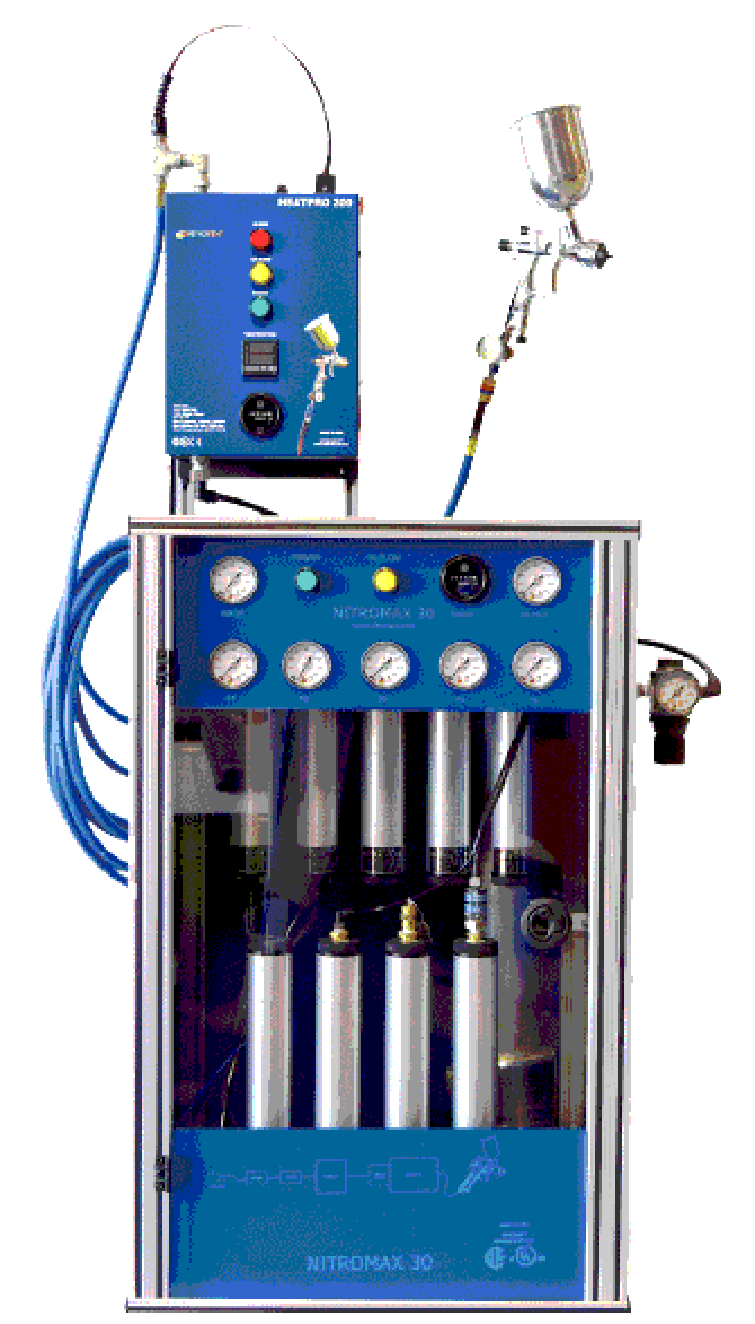 Over the years and the addition of a variety of additional technologies including high performance compressors, dryers and filtration systems, the industry developed a standard for clean compressed air for spray painting of automotive, aeronautical and industrial components. With the demand of higher quality cosmetic finishes of painted products came the need for higher quality spray guns and compressed air (propellant). Nitrogen separation technologies came into play when it was found that spraying paint with a single gas improved the transfer efficiency of the spray gun and provided a higher quality finish. However, nitrogen is a naturally cold gas and this meant that the paint stayed "wet" for longer periods. The addition of a heat source was the solution to that problem and hence the term NitroHeat. This is heated nitrogen. The heat added to the nitrogen solved the challenge of drying times of liquid sprayable paint and other materials. The benefits of this application include: (a) Faster paint curing/drying time, (b) Improved paint transfer efficiency with minimized overspray, and (c) Higher quality finished products.