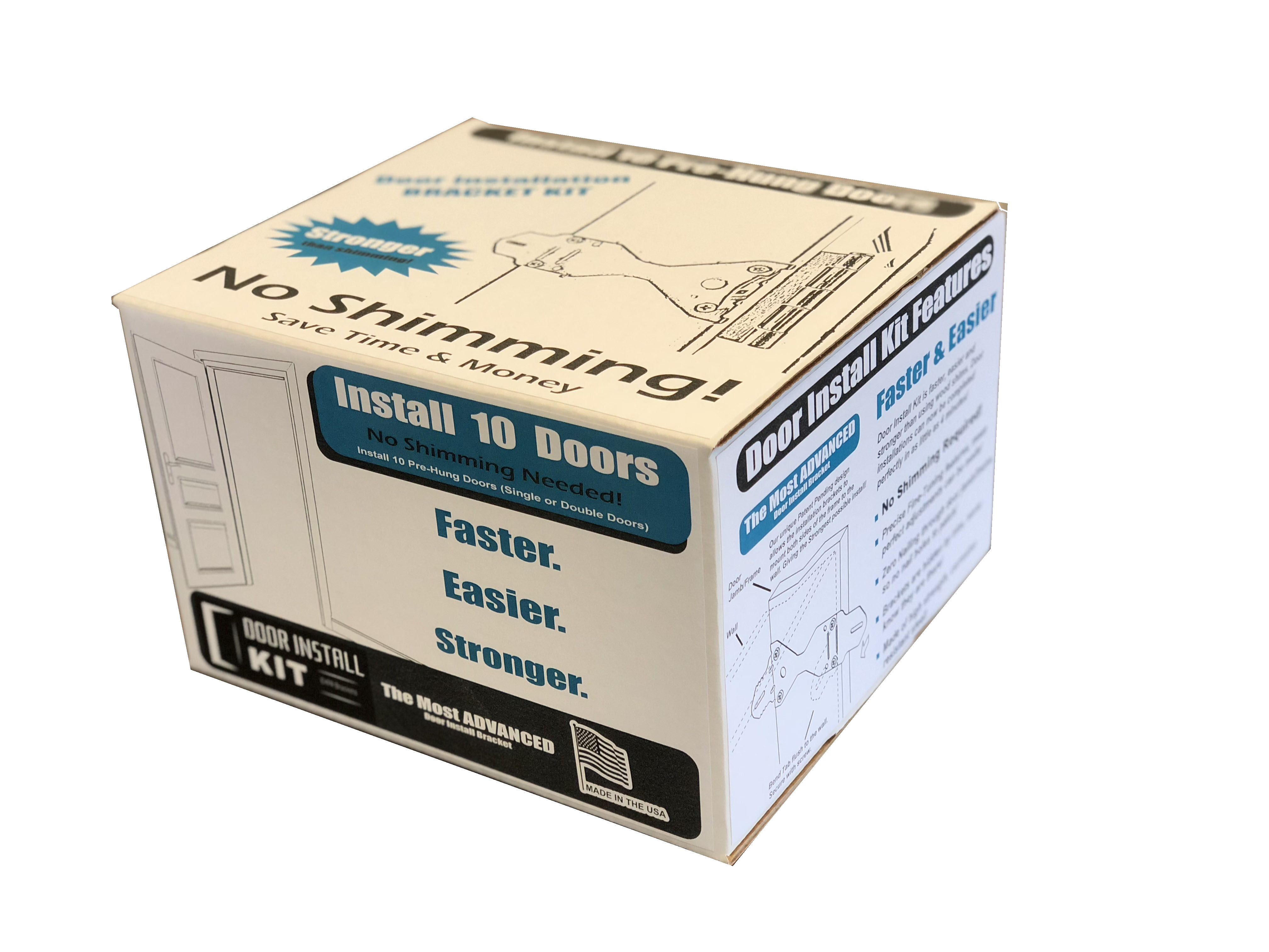 The unique patented and patent pending design allows the installation brackets to secure both the front and back of the door jamb/frame to the wall. This “sandwiching” effect provides the strongest possible door installation — 2-3x stronger than other methods. The brackets stay in the wall and are hidden under the door trim after installation. Also, all the fastening is done to the outside of the door’s frame, so there are no nail holes to patch after the install. The kit works on both exterior or interior doors, as well as either single or double doors. Each kit contains six brackets and all the required screws to do one complete door installation. Also available is a 10-door kit for exterior or interior doors, which includes 60 brackets and all the required screws to do 10 complete door installs. Builders large bulk quantities are also available.