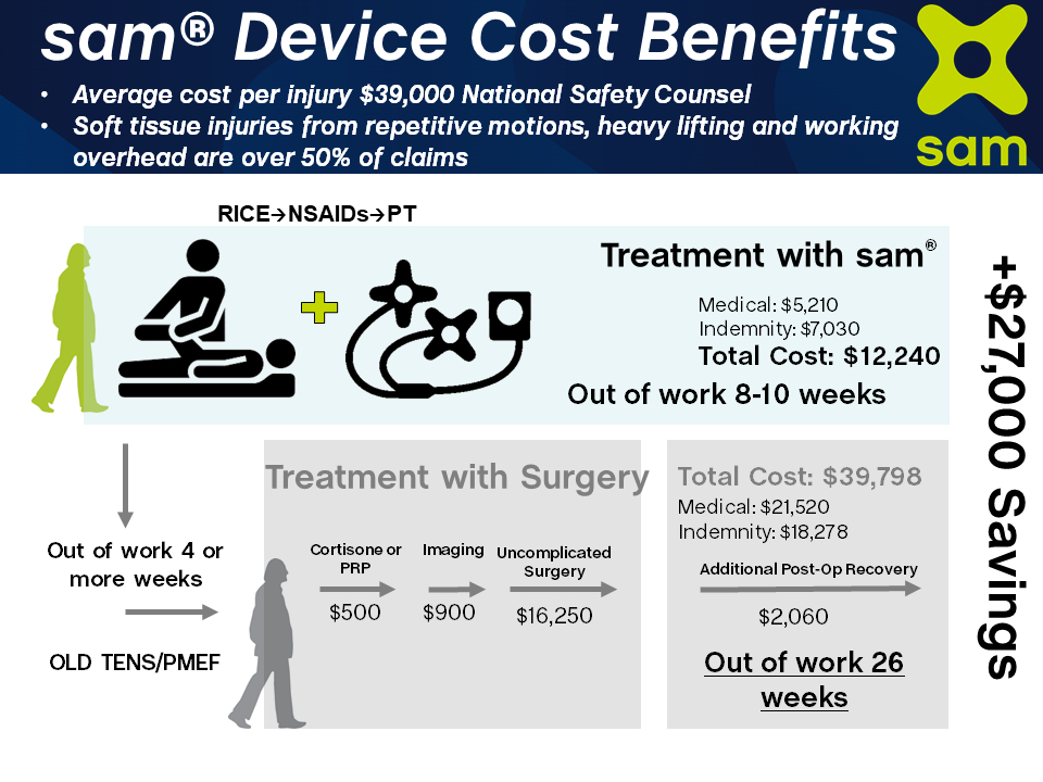 sam® is covered for most government employees, and over 90 percent of workers compensation insurance carriers to help employees get back to work and reduce medication requirements after injury; this includes professional and college athletes who get injured on the job.