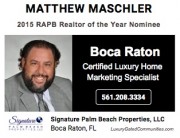 Maschler was nominated as the 2015 REALTOR® of The Year by The REALTOR's® Association of the Palm Beaches and also honored by The Signature Real Estate Companies as their #1 REALTOR® in 2015 for having the highest dollar sales value among more than 400 agents company wide as well as the largest single transaction of the year.