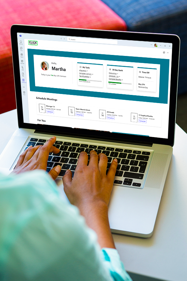 With the Click Boarding application in Teams, onboarding is simplified and enhanced, creating a cohesive and engaging experience for new hires. Meanwhile, HR teams and hiring managers are empowered with complete visibility into progress and peace of mind for foolproof transitions from candidate to employee. Embedded directly in Microsoft Teams, leveraging familiar tools and interfaces within the natural flow of work.