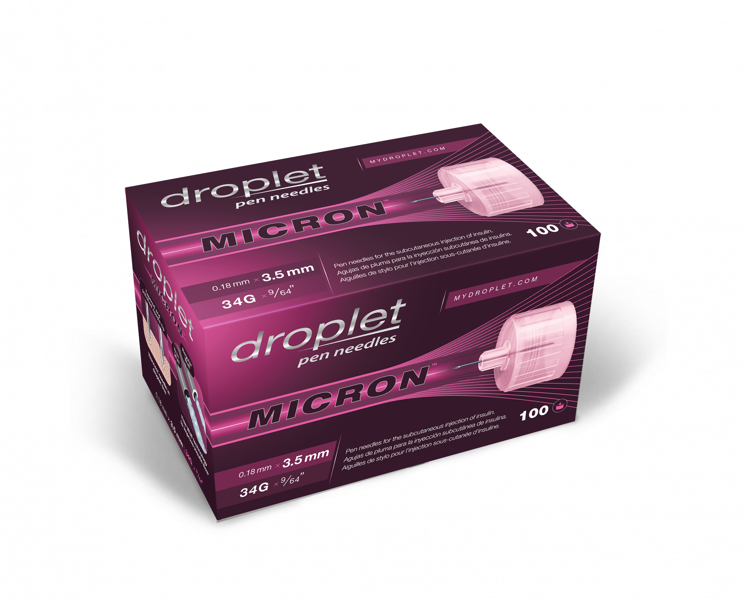 At 34G x 3.5mm, Droplet Micron is thinner and shorter than other pen needles available today. Droplet Micron reduces the penetration force required for an injection up to 50%; previous research has linked reduction in penetration force to a less painful injection experience.