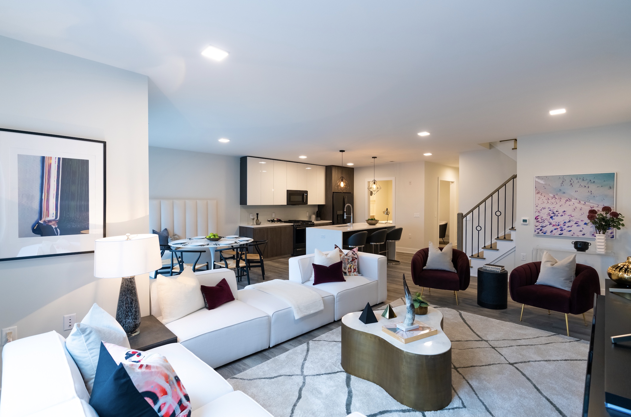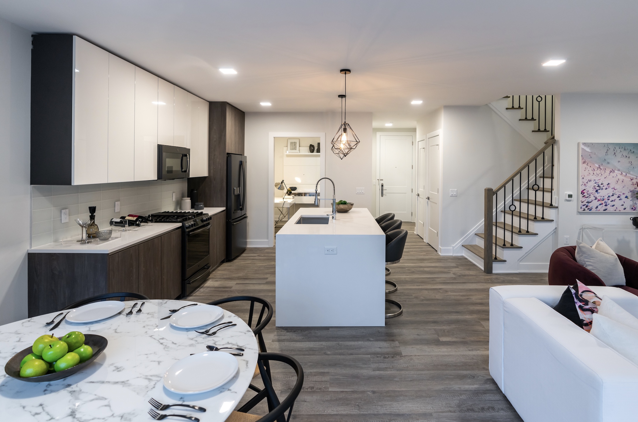 ● Wide-plank wood like flooring in grey wash adds a warm, contemporary touch