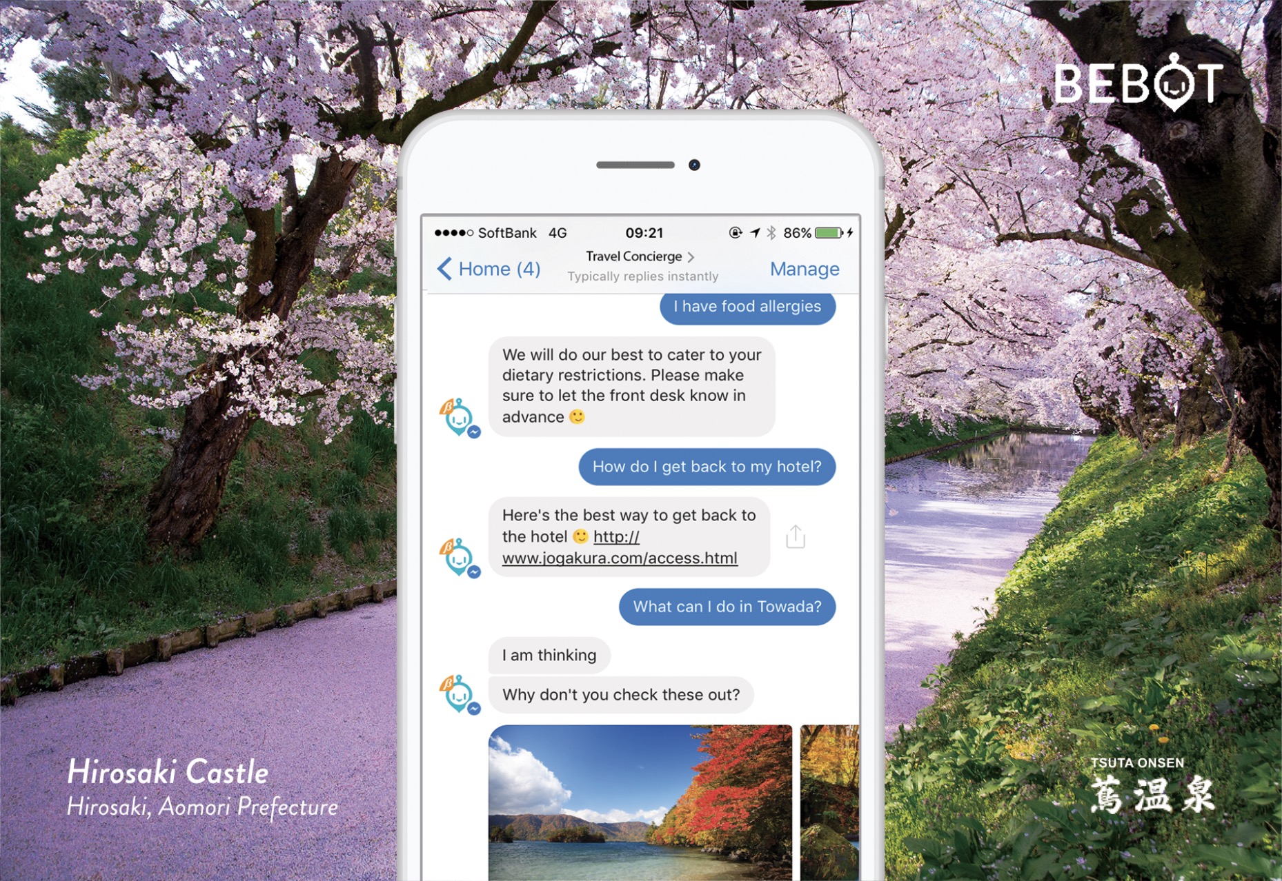 TOKYO, JAPAN, April 19, 2017 (Newswire.com) - Ahead of the Tokyo 2020 Olympic Games, Japan's struggle continues to overcome linguistic and cultural barriers for the increasing number of tourists. Unsurprisingly, one of the top complaints from the tourists is the communication difficulty with the locals, especially outside the major cities. To respond to such challenges, Tokyo-based Bespoke, Inc. is launching Japan’s first artificial intelligence (AI) chatbot concierge BEBOT in two historical hotels of the Aomori prefecture: Tsuta Onsen and Hotel Jogakura.