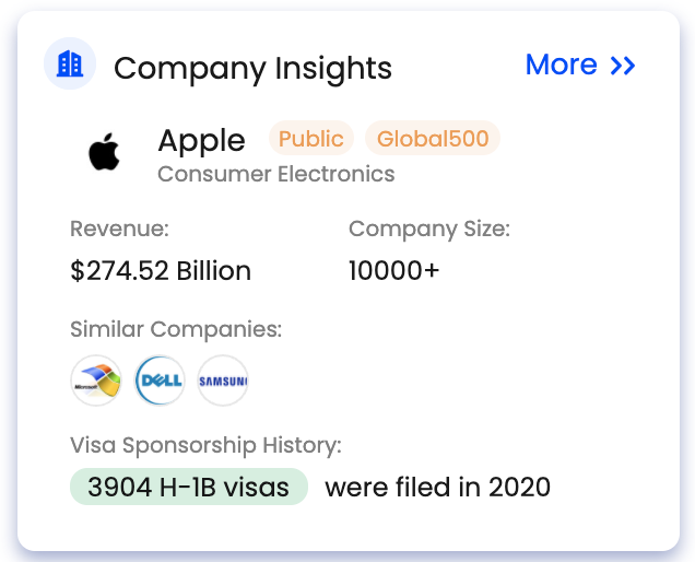With Visa Sponsorship Feature, users may find any companies' visa sponsorship information by expanding the Company's Insights tab and discovering how many work visas the company has filed in the past, making the job search process more transparent. While dissecting through the relevant companies that sponsor visas, users can still use other existing features to further strategize their job search process.