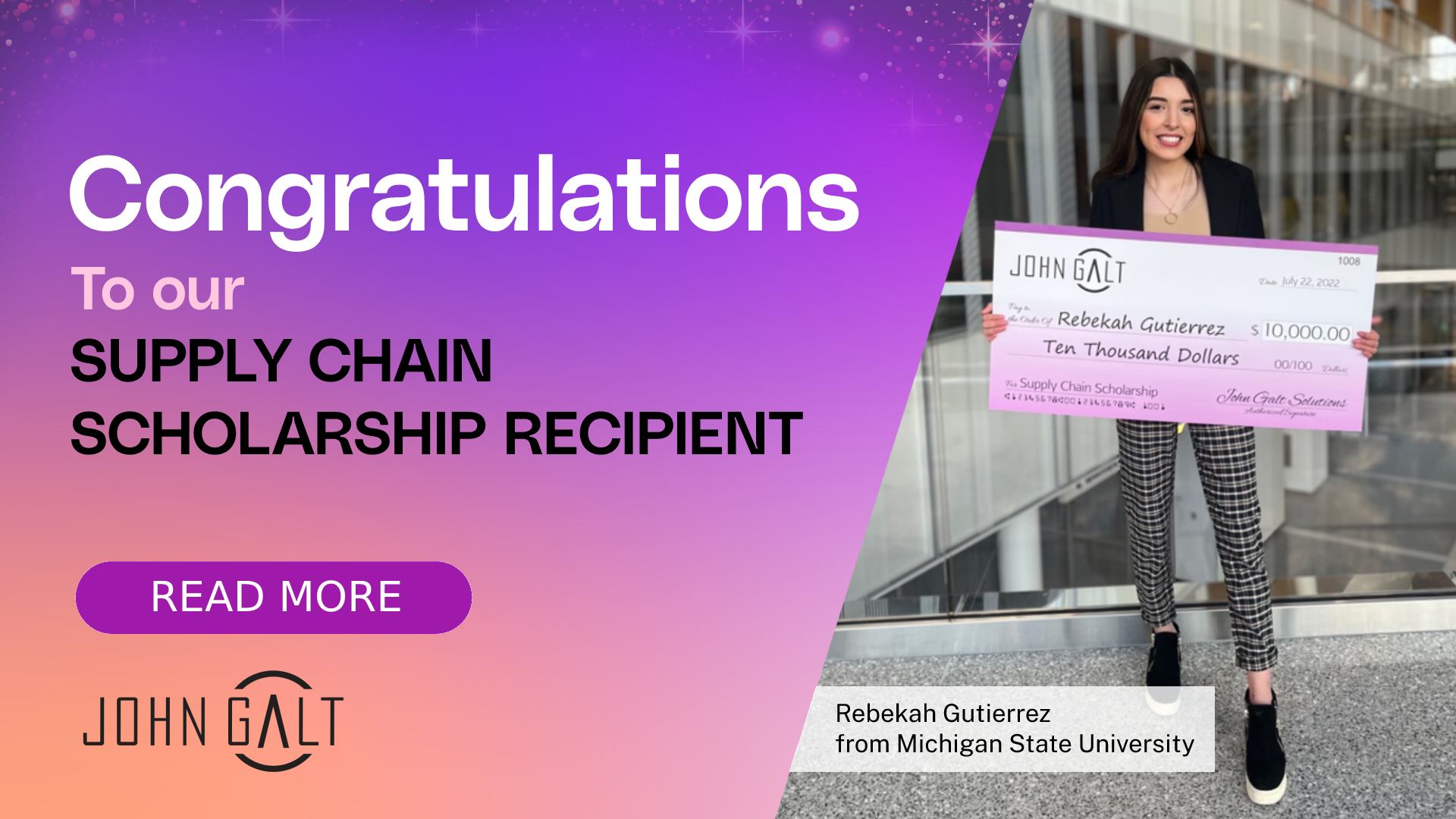 AUSTIN, Texas, August 2, 2022 (Newswire.com) - John Galt Solutions, automating supply chain planning to empower business leaders to make better decisions faster, is pleased to announce the recipient of its bi-annual scholarship is Rebekah Gutierrez, a third-year student at Michigan State University (MSU), Eli Broad College of Business, pursuing a BA in Supply Chain Management with a minor in Entrepreneurship and Innovation.