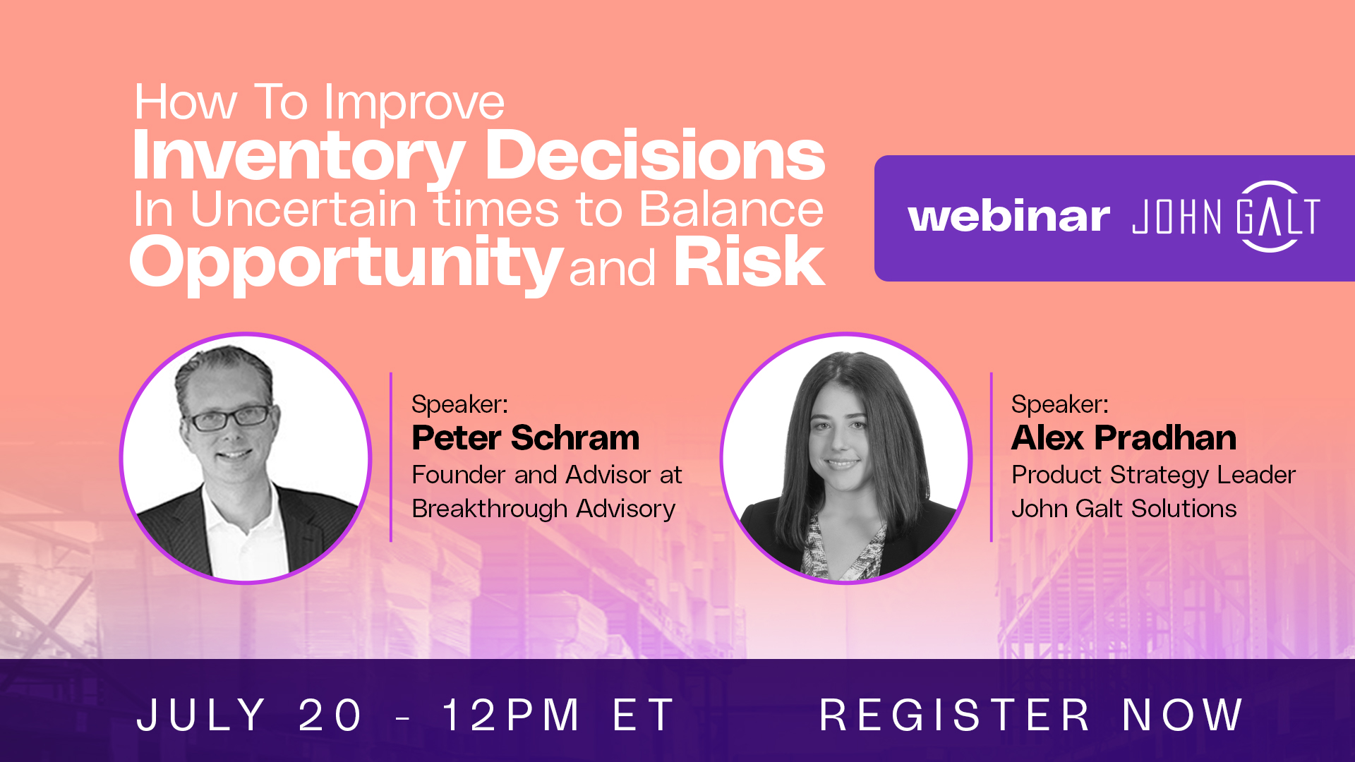 AUSTIN, Texas, July 14, 2022 (Newswire.com) - John Galt Solutions, automating supply chain planning to empower business leaders to make better decisions faster, will host the live workshop, How to Improve Inventory Decisions in Uncertain Times to Balance Opportunity and Risk, on July 20, featuring Alex Pradhan of John Galt Solutions and Peter Schram of Breakthrough Advisory. The interactive event invites attendees to join the conversation as they explore multiple inventory strategies to help minimize the impact of supply chain uncertainty.