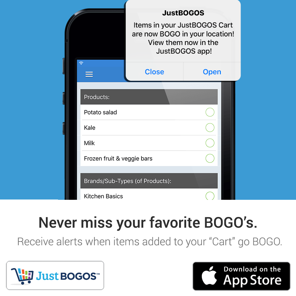 With the new JustBOGOS app for iPhone and iPad, it's easier than ever to save money on your groceries, stay "in the know" of your favorite BOGO's, and manage your Shopping List ... All in one place.
