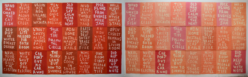 Heap of Birds' mono print installations exist in two combined forms -- a set of primary prints accompanied by a set of ghost prints. The primary mono prints are the first pull from the print-making plate, while the ghost prints are from the second plate pull. As Heap of Birds notes, "[t]he primary mono prints are strong, bright, and bold, thus articulating the way Indigenous life develops, grows, and survives in spite of the American empire. The faint color, blurred text, and sometimes obscured image treatment of the ghost mono prints represent the United States of America's refusal to accept Native Indigenous Nations, their history, and the brutal holocaust perpetrated on our Nations by the ruling republic."