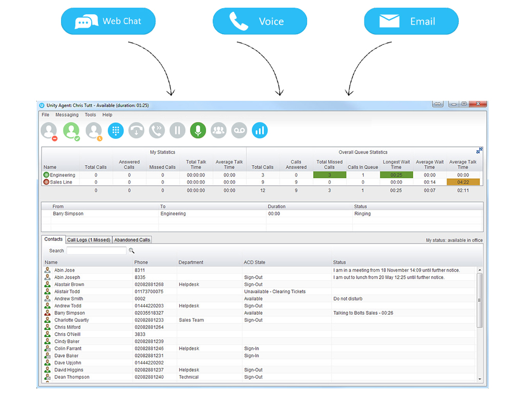 For contact center agents, all media types can be handled within the single Unity Agent interface providing a seamless contact handling experience. For BroadSoft-based Service Providers this increases functionality for existing call center customers already on the BroadWorks platform. The ability for Unity to blend any type of incoming call, call back request, webchat or email to an available Agent is crucial in presenting the contact center as a unified solution.