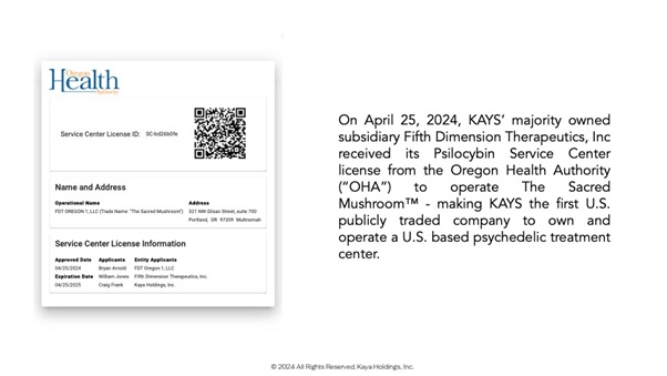 FT. LAUDERDALE, FL, June 5, 2024 (Newswire.com) - Kaya Holdings, Inc., ("KAYS" or the "Company") (OTCQB:KAYS) announced today that its majority owned subsidiary, Fifth Dimension Therapeutics, Inc. has begun accepting appointments at its The Sacred Mushroom™ ("TSM") Psilocybin Treatment center in Portland, Oregon.