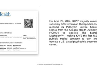 "Completion of the first "The Sacred Mushroom™" Psilocybin Treatment Facility is an important milestone for KAYS", said David Jones, KAYS Senior Advisor for Business Development and Financial Operations. "Wall Street has taken notice of the need for Psychedelic Medicine as an alternative approach for treating mental health disorders, and KAYS intends to secure its place in the value chain through the opening its Psychedelic Treatment Centers."