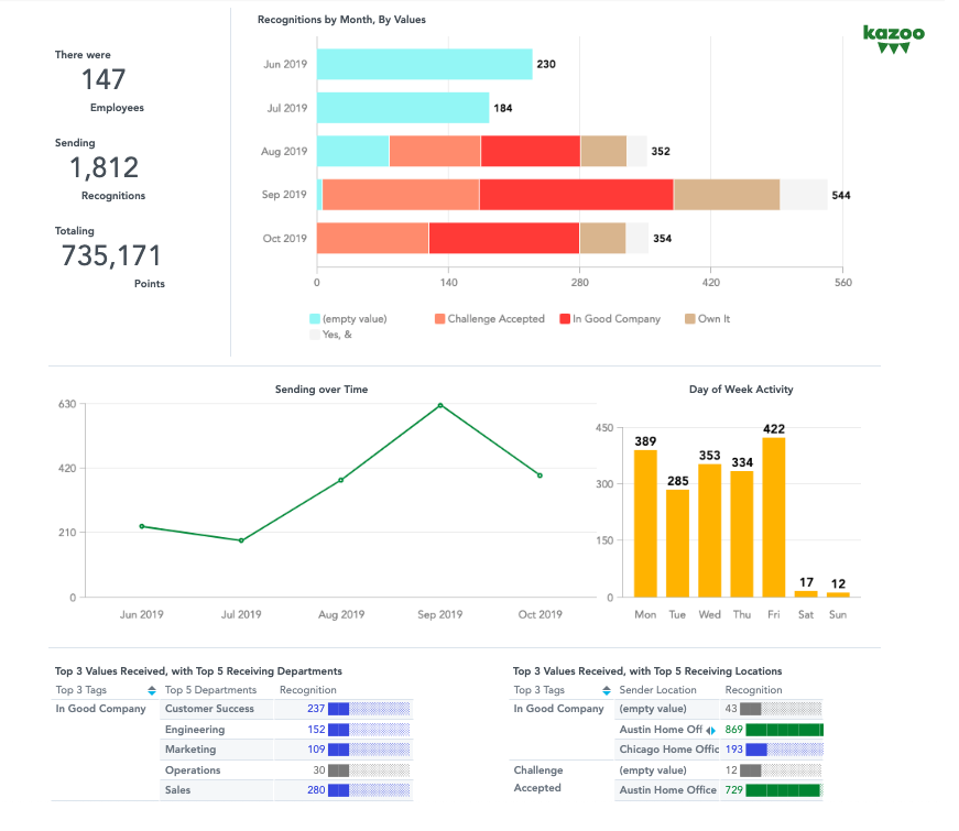 “As a company, our focus this year has been to provide better data to our customers so they can truly see the impact of their employee experience programs,” said Sapna Gulati, EVP of Product at Kazoo. “By updating our Insights & Reporting capabilities for our Recognition & Rewards platform, we are providing HR leaders with the data they need to be strategic business partners that drive decisions across their organizations.”