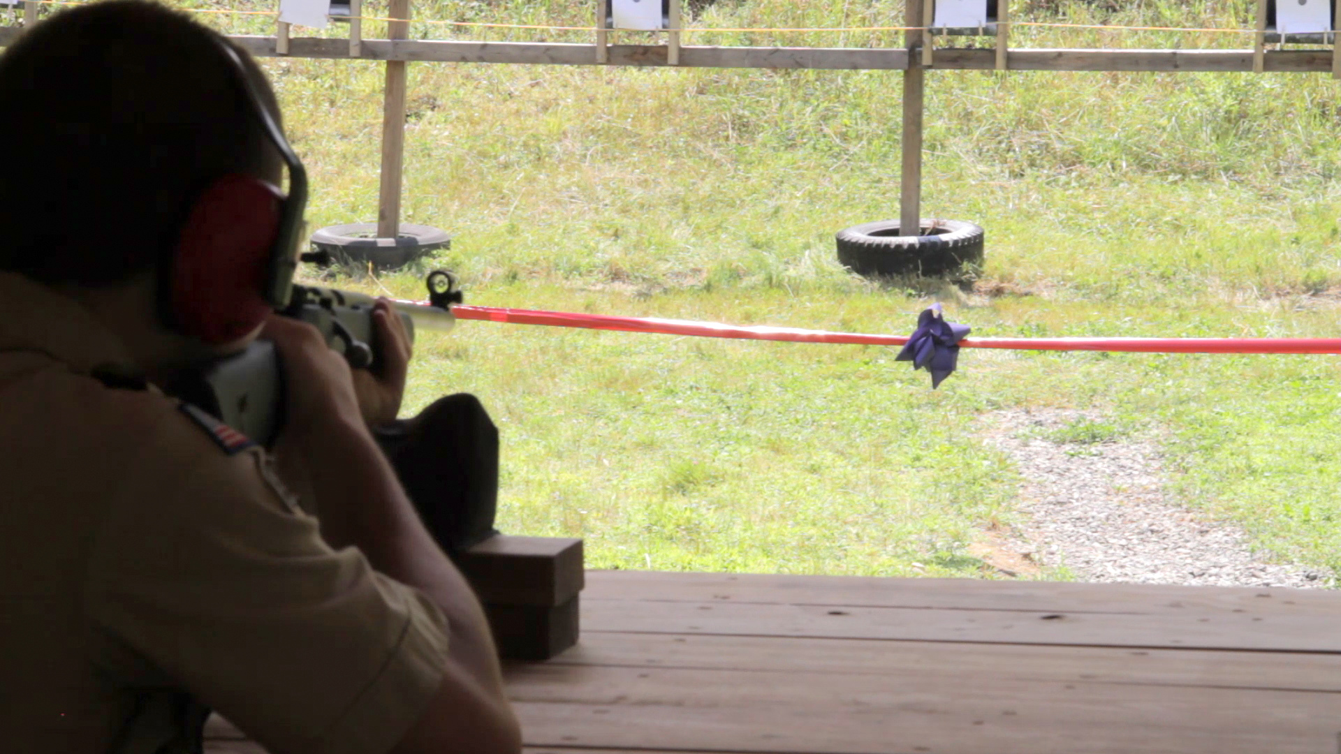 The grand re-opening for Camp Workcoeman's rifle range featured a ribbon "shooting," where eight Boy Scouts aimed rifles at a ribbon that surrounded the rifle range. Representatives of KBE, including Principal and CEO Mike Kolakowski, attended the ribbon shooting in order to present the $10,000 donation.