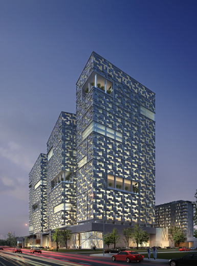 Three office towers are situated along the northern portion of the site with their address along the Main Street and step from 25 storeys at the northeastern corner to 29 storeys at the northwestern corner of the site. Elevated sky gardens are located in strategic locations of each tower to offer tenants a connection to nature and break up the mass of the building.