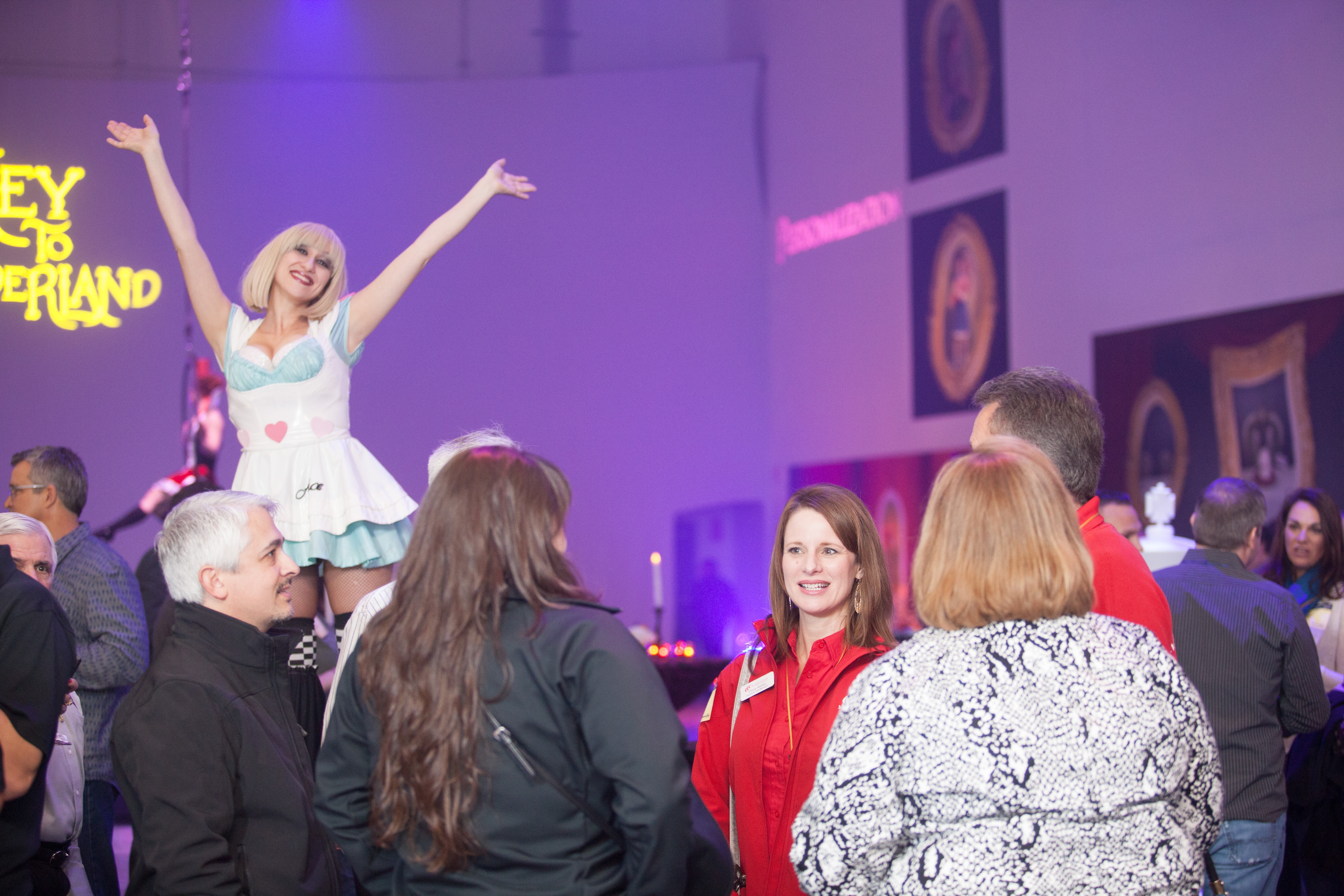 During the event, stilt walkers, dressed as Alice and the Mad Hatter, along with the miniature White Rabbit from the story, walked among guests and encouraged them to have fun. A strap aerialist performed daring stunts to the delight of attendees. And, an acrobat balanced himself on chairs stacked reaching 25-feet high, seemingly defying gravity. Entertainment was coordinated by Posh Productions.