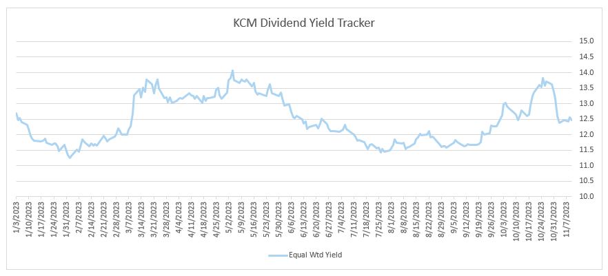 DVDN selects these portfolio positions from an investment universe of the 75 publicly listed equities issued by MREITs, CREITs and BDCs that comprise the equal-weighted Kingsbarn Capital DVDN Yield Tracker1.