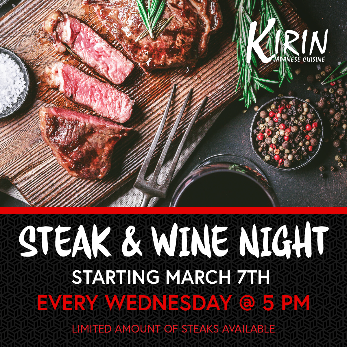 Kirin Sushi Announces Wine and Steak Night