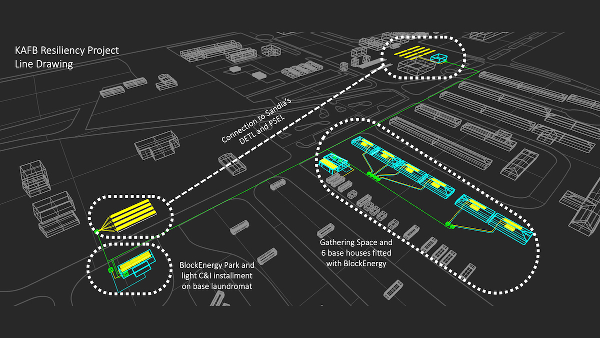 The Kirtland Resiliency Project is comprised of a 250 kW microgrid, including 100kW of solar and 220 kWh of battery storage. The pilot project uses rooftop solar and modular nanogrids, called BlockBoxes, that contain batteries, power electronics and distributed controls installed at various homes within the project site. In addition, the project hosts a community center on base. These resources are supplemented by other centralized foundations including solar and storage at BlockCentral, a localized area on-site that is a source and sync resource for the microgrid. A scalable distributed control architecture also allows for seamless integration of new loads into the microgrid, managing ongoing operations of the system in real time, employing artificial intelligence methods.
