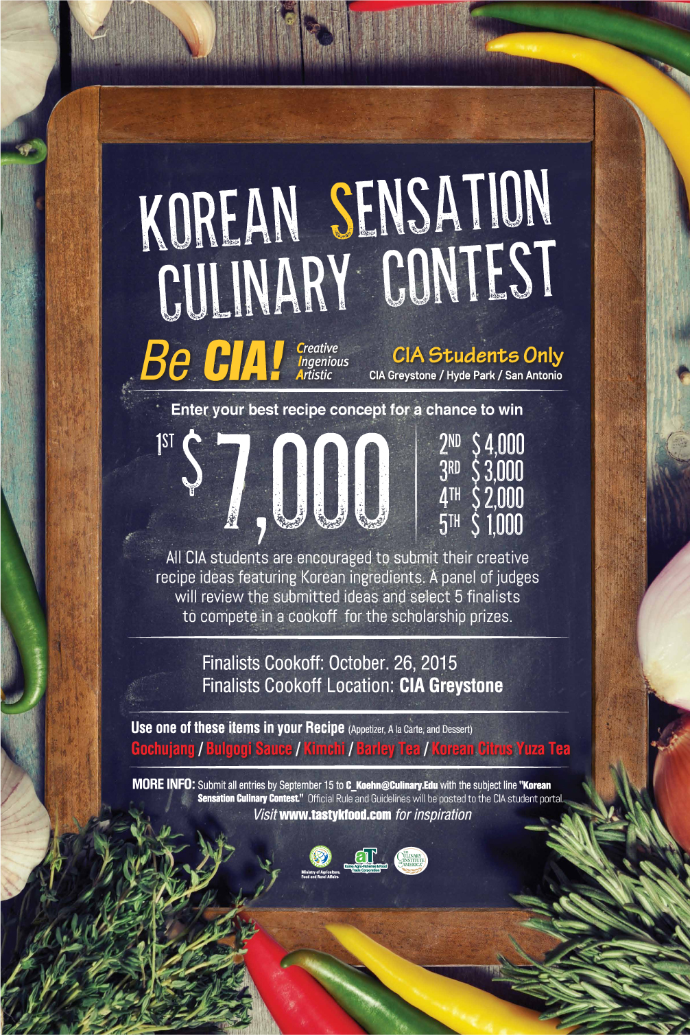 The finalists will prepare their a la carte recipe using one of the following authentic Korean ingredients; barley tea, kimchi, bulgogi sauce or gochujang. Students can use traditional foods from Korea for inspiration or play with modern elements to create something completely new, but that still looks and tastes amazing. Finalists will have to be creative and adaptable in the cook-off where they will prep and cook their recipes in front of an audience and judges. The competition should be intense as the finalists compete for scholarship awards with the 1st place winner receiving $7,000, 2nd $4,000,3rd $3,000, 4th $2,000, and 5th $1,000.