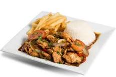 Lomo Saltado is what one would call a "Peruvian Beef Stir Fry". This tasty Beef platter comes with white rice and french fries. It's delicious. Lomo Saltado is satisfying beef stir fry seasoned with salt and pepper with made up of garlic, tomatoes, yellow pepper, onions, vinegar, and a mix of soy sauce at the end to top it off.
