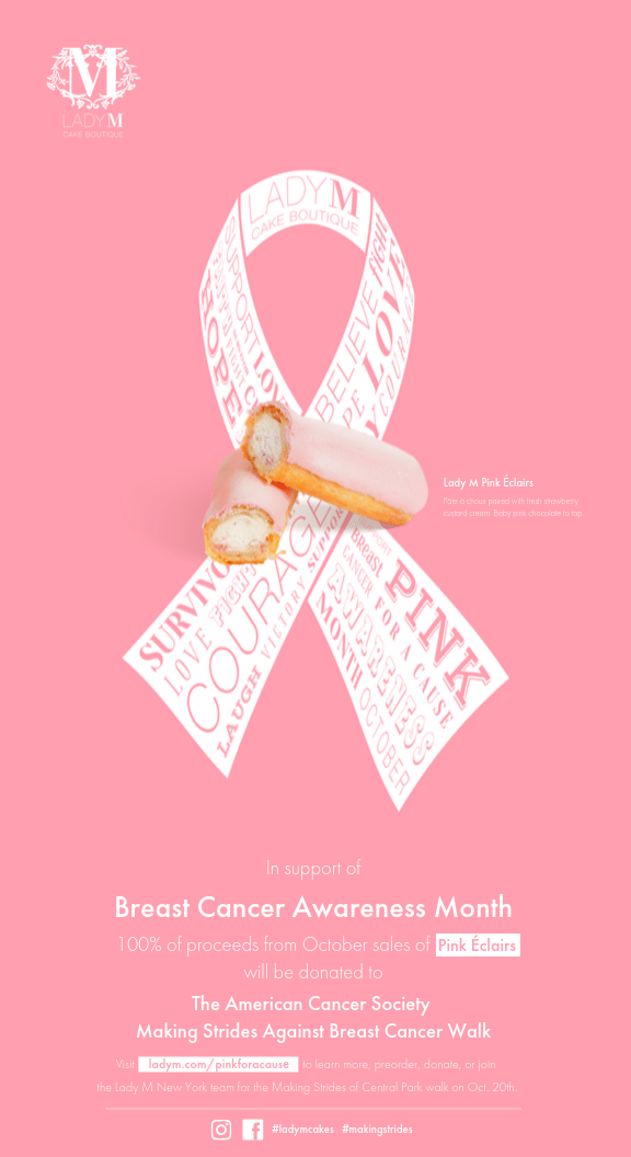 How can Lady M fans participate? Visit Lady M's Pink for A Cause page to learn more and 1) Purchase Pink Éclairs (available at all Lady M U.S. boutiques from Oct. 1-31, 2019). 2) Join our Lady M New York team for the Making Strides of Central Park Walk on Oct. 20, 2019. 3) Donate directly online.