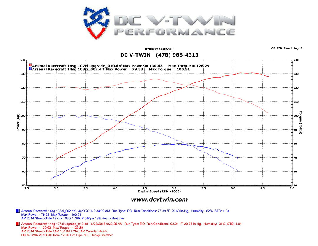 DC V-Twin used a stock 2014 Harley-Davidson Street Glide with a VHR Pro Pipe and a SE Heavy Breather as the test bike and the Dyno results were 78.4 HP and 99.5 Foot Pounds of Torque. When the AR-107 kit was bolted on, it went to 131.7 HP and 117.8 Foot Pounds of Torque. That is an industry best 65%+ horsepower, turning a standard Harley-Davidson into a performance machine that has been extensively tested. This Arsenal Racecraft Performance Kit will provide industry-leading performance with bulletproof durability that will outperform anything else on the market. The company is releasing its performance parts catalog for Indian motorcycles in the first quarter of 2017.