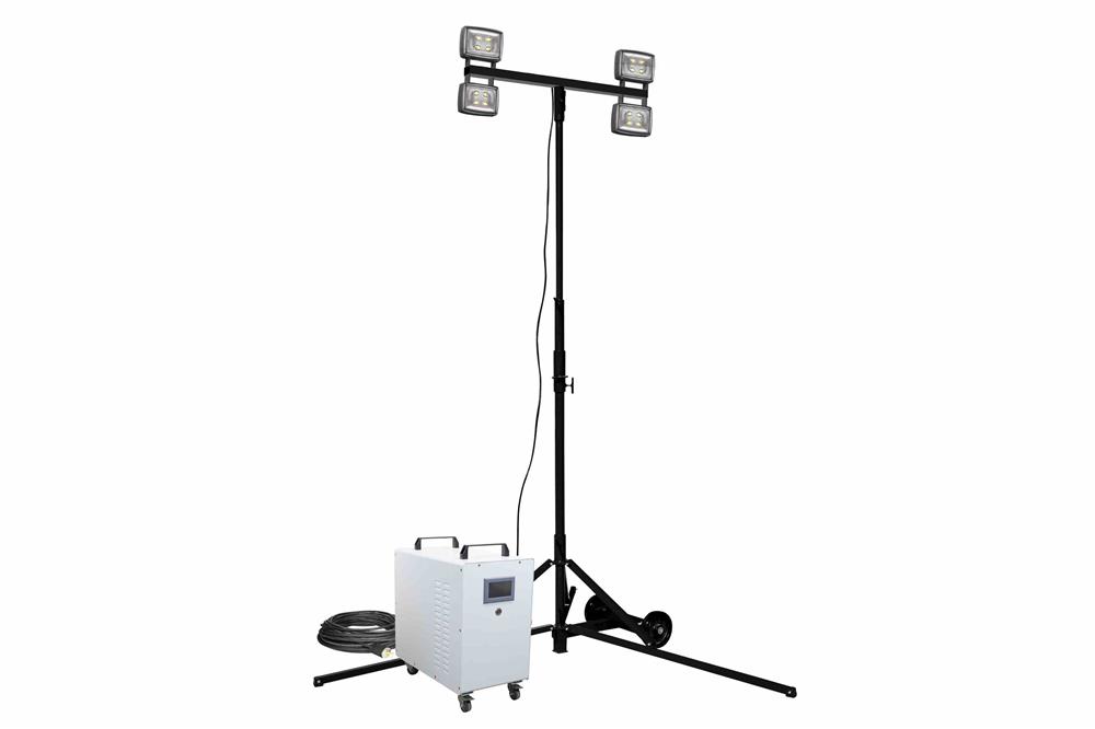 The battery pack comes with AC and PV charging options, dual handle grips on the top and four rotating wheels at each corner for easy transportation. The tripod is made of aluminum with a telescoping pole that raises the tripod and legs that can be completely collapsed for easy transportation. The tripod’s base measures 22.5” wide by 22.8” deep by 95.75” tall. Suitable applications include use at industrial sites and remote locations, for temporary lighting indoors or outdoors, and more.