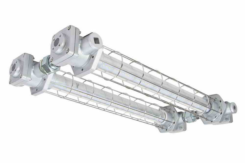 Larson Electronics’ explosion-proof, low-profile LED fixture offers 60,000 hours of lamp life with 80% lumen retention. The LED assemblies in this unit provide a 100˚ horizontal beam spread and 140˚ vertical beam spread. This fixture features tempered borosilicate glass tubes that protect the LED assemblies, which are themselves protected by an aluminum wire guard to prevent damage to the fixture.