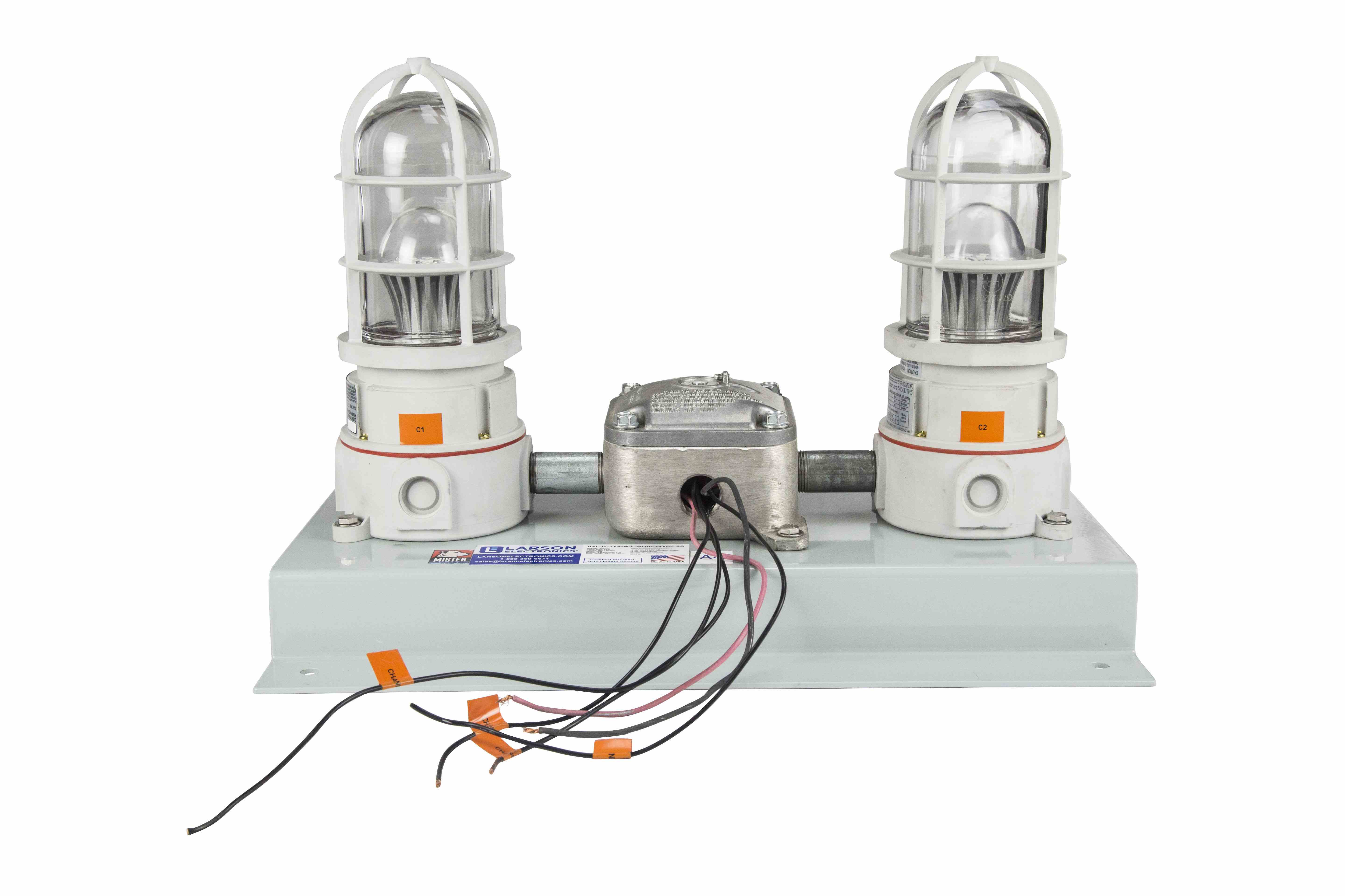 This unit is housed in an explosion-proof enclosure and is mounted by a heavy-gauge aluminum base with four pre-drilled holes that allow the unit to be bolted to walls and other flat surfaces. This unit comes with two cords equipped with straight blade plugs that allow for independent operation of each lamp. Suitable applications include hazardous commercial and industrial locations.