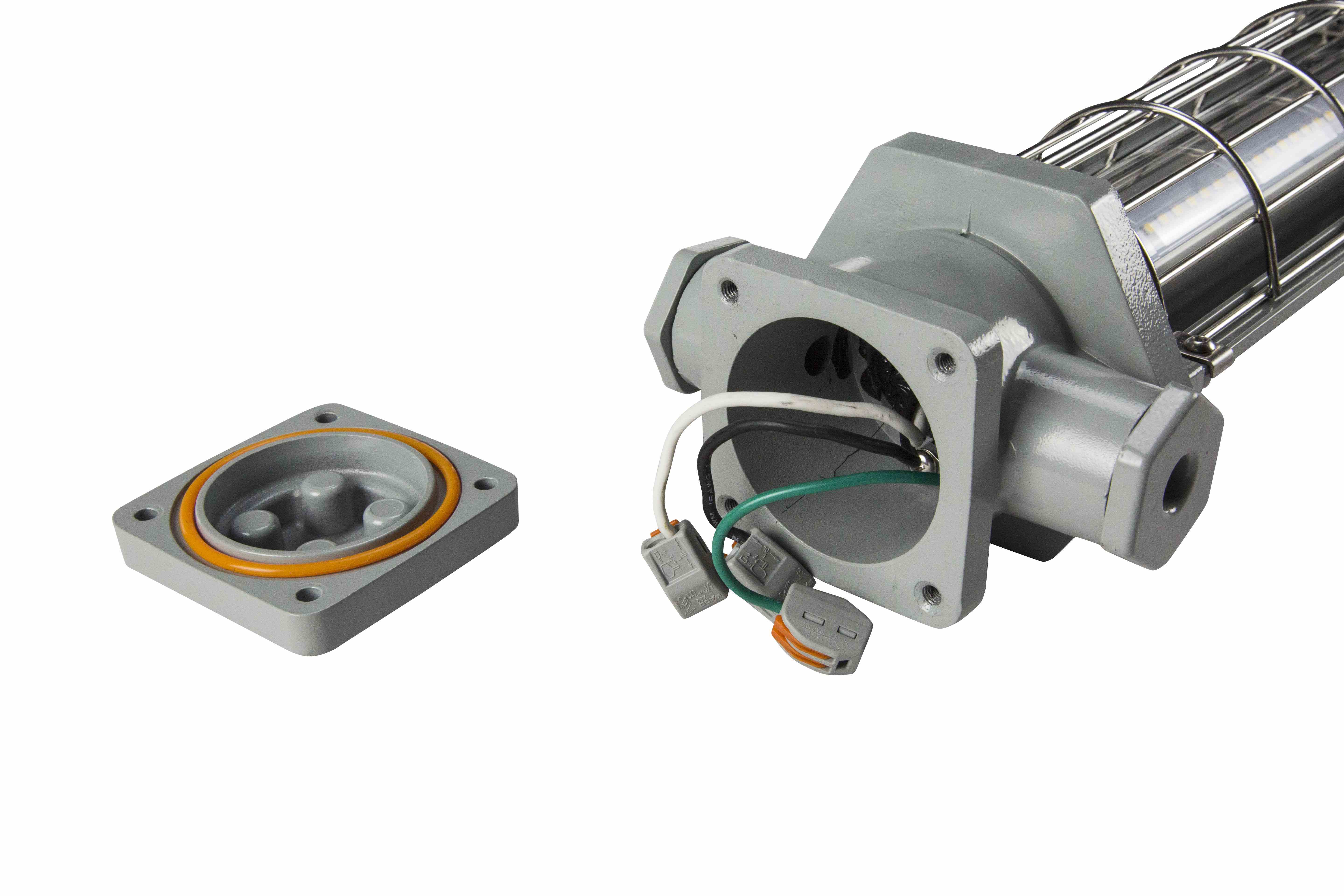 Larson Electronics’ low-profile, explosion-proof LED light fixture features a 60,000-hour rated lifespan with 80% lumen retention. This unit features two offset LED assemblies that allow the lamp to provide a 100˚ horizontal beam spread and 140˚ vertical beam spread. The LED assembly is protected by a tempered borosilicate glass tube that is protected by a wire guard made of aluminum. This unit is universal voltage capable and can operate on 100-277V AC 50/60Hz and is IP67 rated.