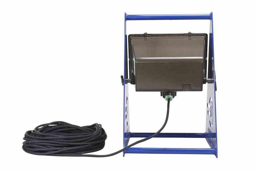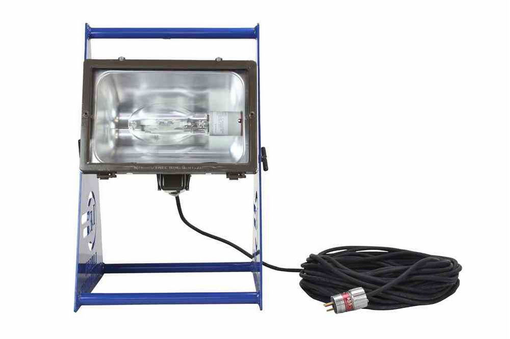 The EPL-PM-1X400MH-200 portable 400-watt hazardous location light is rated for use in Class I, Division 2, Groups A, B, C and D hazardous locations. This light is pedestal mounted and comes equipped with a 400-watt metal halide lamp. This unit features 200 feet of abrasive and oil resistant 16/3 SOOW cord terminating in a Class I, Division 1 explosion proof plug. The metal halide lamp is mounted to a metal pedestal platform with adjustable T handles to provide vertical adjustability.