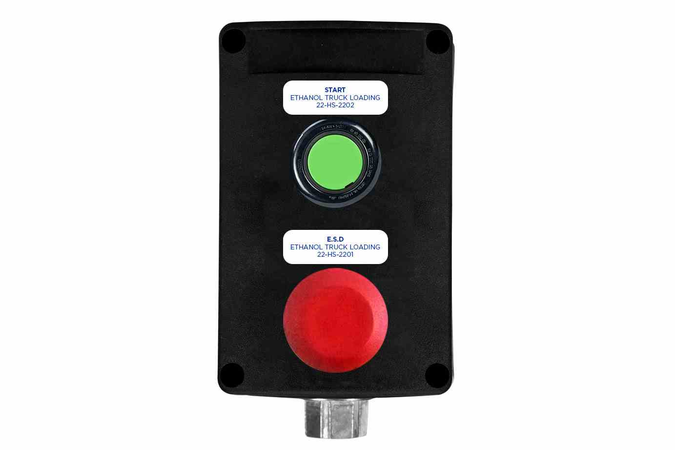 The ATEX-EPCS-FG-1XPB.G-ESTP-24V-5A-R1-MOD1 explosion proof control station is rated for use in ATEX/IECEx flammable work environments. This flameproof unit allows operators to access one feed-thru momentary green push-button with one NO and one NC contact. The green push-button features a white label with blue text that reads ‘START ETHANOL TRUCK LOADING 22-HS-2202’. Operators can implement emergency stop with a red mushroom head push-button with one NO and one NC contact. The white label with blue text for this component reads ‘E.S.D. ETHANOL TRUCK LOADING 22-HS-2201’.