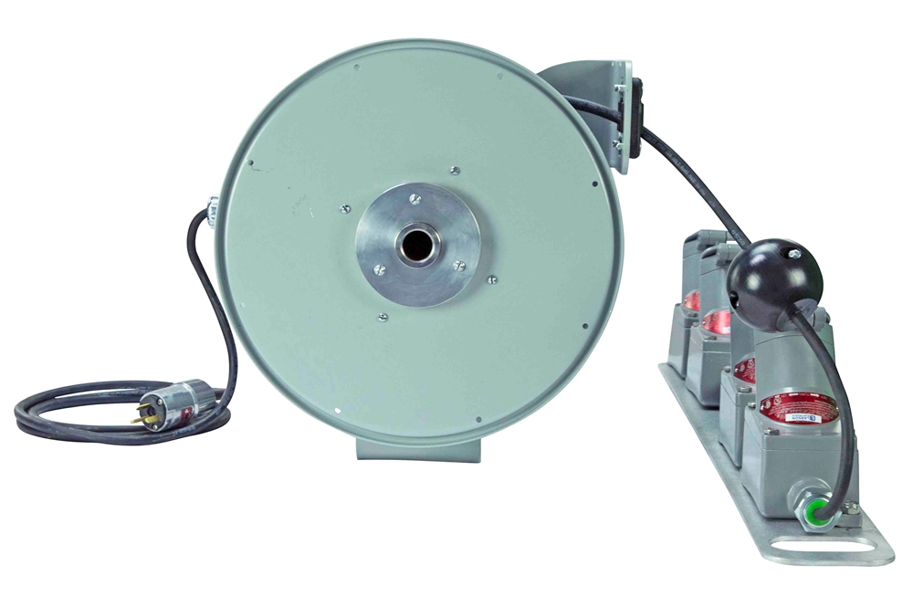 Larson Electronics’ explosion proof cord reel includes an integral spring actuated ratcheting mechanism for positive cord management housed within the threaded slip ring enclosure. This unit features an aluminum backplate that holds the receptacles and features a handle cutout for carrying. Suitable applications include for use with drop lights and tools in hazardous locations where connection to fixed receptacles is not available or is impractical.
