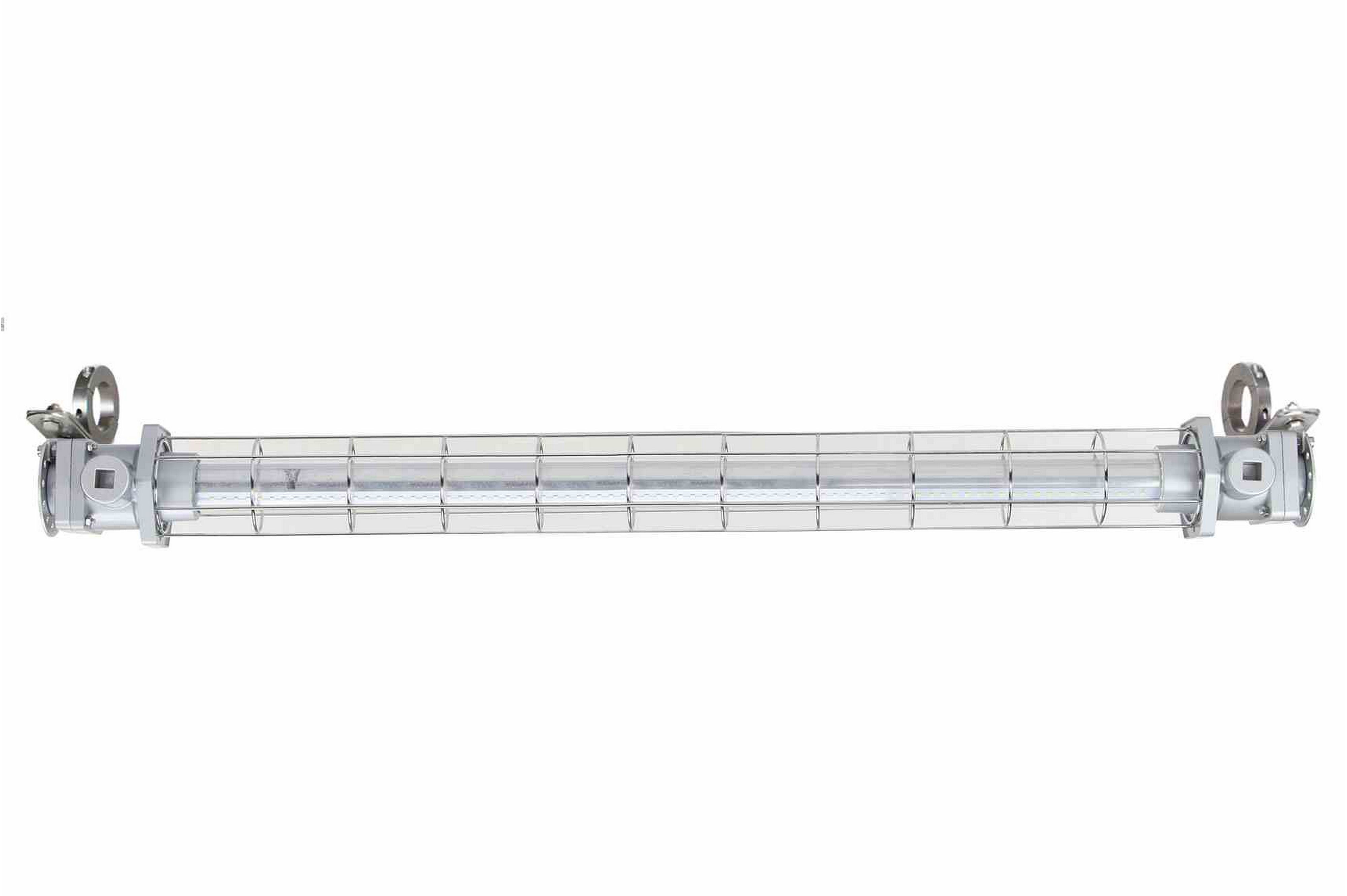 Larson Electronics’ explosion proof low-profile LED fixture features two offset LED assemblies that allow the light to produce a 100-degree horizontal beam spread and a 140-degree vertical beam spread. The LED assembly is protected by a tempered borosilicate glass tube that is protected by an aluminum wire guard to prevent damage to the fixture. This unit is universal voltage capable and can be operated on 100-277V AC 50/60Hz.
