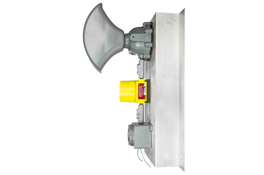 The EPL-TL-PA-AT-GSPB explosion-proof toxic gas sensor with an audible horn is rated for use in Class I, Division 1, Groups C and D; Class II, Division 1, Groups E and F; and Class III hazardous locations. This combustible gas warning system for flammable work sites features an electrochemical toxic gas transmitter/sensor and horn for audio notifications. This unit operates on 120/240V AC or 24V DC for both standard and low-voltage operations.
