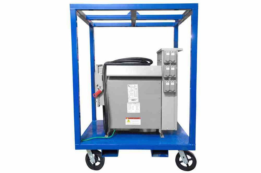 This unit has 1/8” metal side walls to prevent tampering with two 1/8” hinged doors providing access to the disconnect, breaker panel and receptacles. The transformer is grounded to the frame with a grounding lug that is provided. Suitable applications include construction sites, plant maintenance and turnarounds, and more.