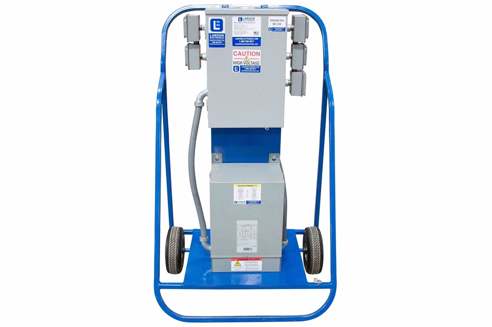 Larson Electronics’ temporary power distribution system features a portable panel and load center/distribution assembly that is mounted to a powder coated steel dolly cart style frame. The mounting platform features four casters and a center point lift point that allows for easy lifting with cable or chain hooks. This transformer is grounded to the frame via a grounding lug that is provided. Suitable applications include indoor and outdoor use, construction sites, plant maintenance and turnarounds, and more.