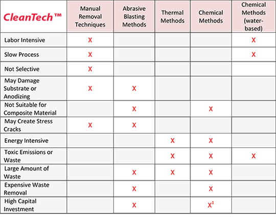 There are also minimal health hazards since there are no emissions or waste other than the coating residue removed by the vacuum system. Therefore, waste disposal costs are significantly decreased and emission standards can be met with reduced regulatory compliance, decreasing capital and operating costs. Additionally, the laser ablation process can selectively remove single layers or multiple layers depending on the needs. The precise control removes layers down to the unaffected substrate below and eliminates the need for masking difficult partial coatings.