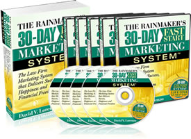 "The Rainmaker's 30-Day Fast Start Marketing System" is a step-by-step method detailing the ways to successful law firm marketing. This 30-Day legal marketing system consists of a series of specific, results-driven actions that can easily be performed by staff members.