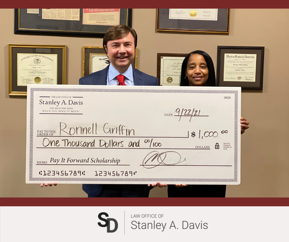 NASHVILLE, Tenn., October 20, 2021 (Newswire.com) - The winner of the annual Law Office of Stanley A. Davis Pay It Forward Scholarship was announced by the firm on September 22, 2021. The Law Office of Stanley A. Davis awarded the scholarship to Ronnell Griffin. Ronnell is the Judicial Assistant for Judge Kelvin Jones and a current law school student at Nashville School of Law. Ronnell has shown an outstanding commitment to making a difference in the legal field.