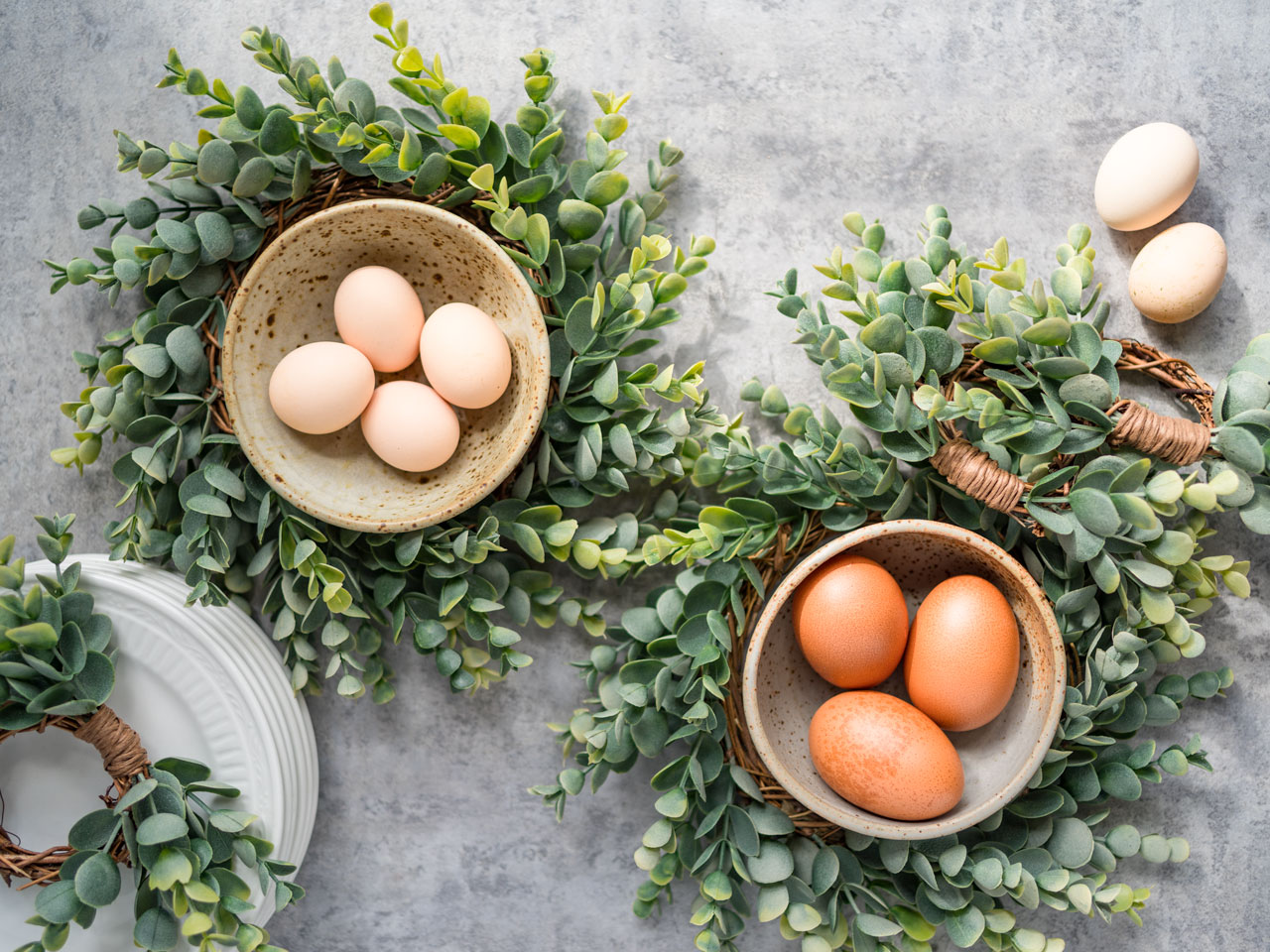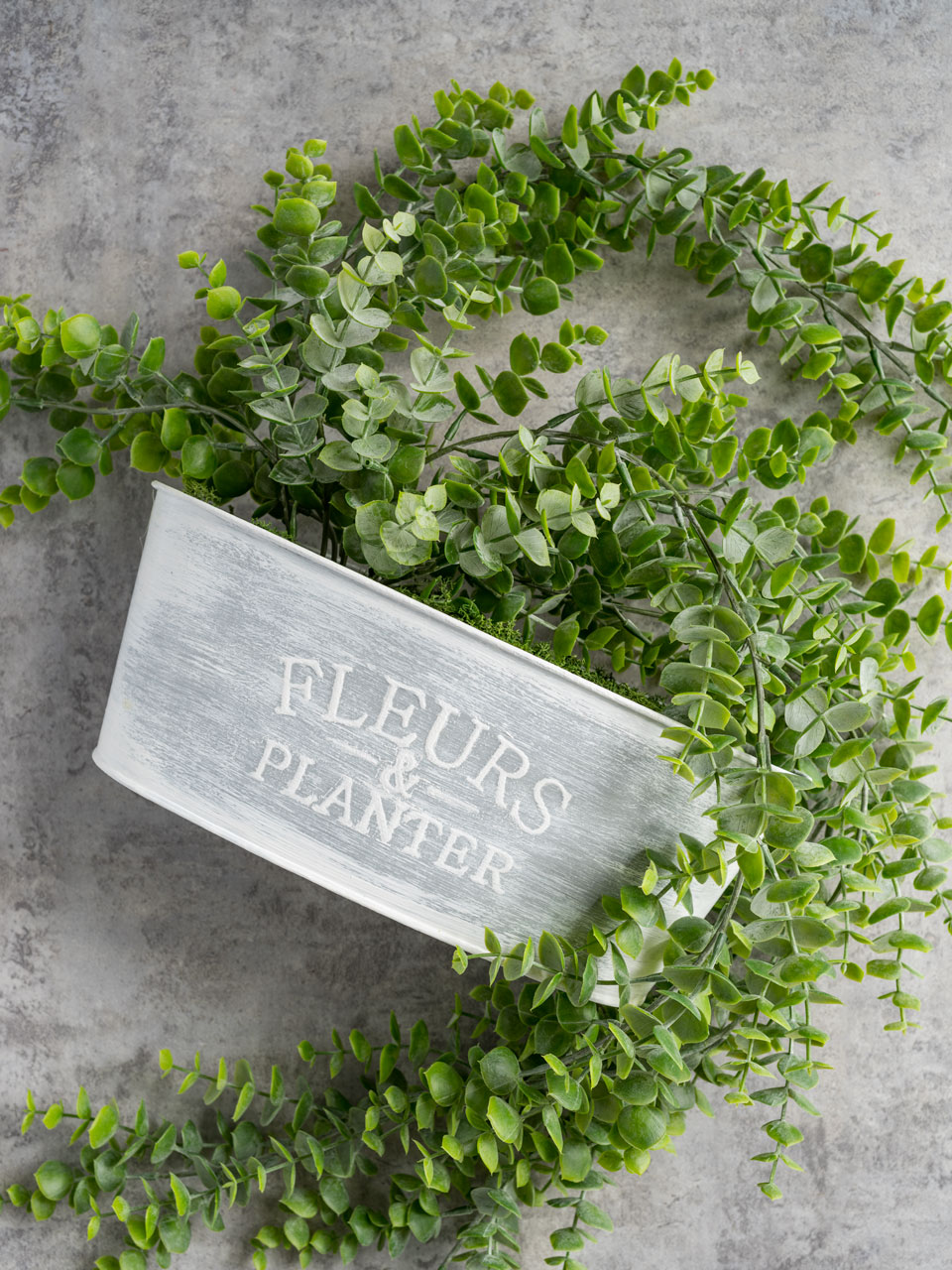 The themes of the new line are soft greenery and textured neutrals. Permanent botanical greenery items include large and small grapevine wreaths, candle rings and napkin rings in frosted eucalyptus and two draping arrangements, one of eucalyptus vine and the other of trailing succulents, both in French provincial galvanized garden planters with distressed-paint finishes in gray-and-white and black-and-cream colorways. Textured neutrals include large and small wreaths, candle rings and napkin rings featuring a grapevine garland with off-white pip beads.
