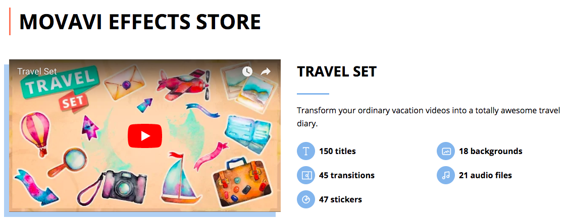 LOS ANGELES, April 30, 2018 (Newswire.com) - Movavi, a leading multimedia software developer, has released the Movavi Effects Store, where users can purchase sets of titles, stickers, transitions, backgrounds, and music to liven up projects created with different Movavi programs.