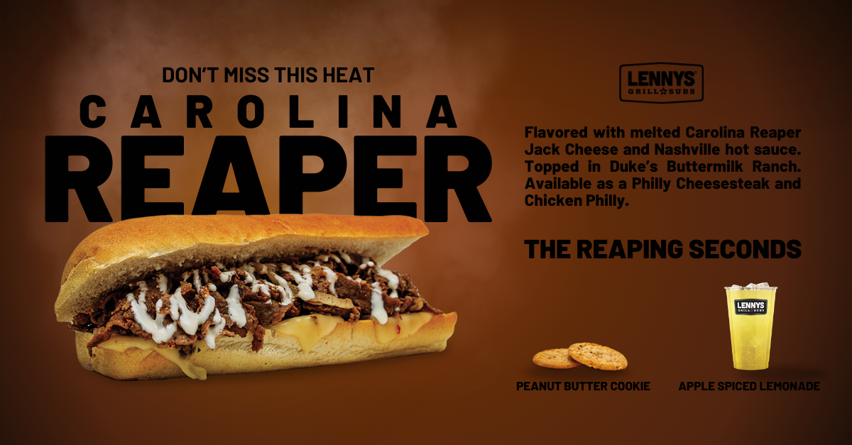 The Carolina Reaper Subs and Reaper Seconds are available for a limited time only at Lenny's Grill & Subs locations, online at order.lennys.com, via the Lenny's App, and through third-party delivery platforms. Be sure to grab this explosive flavor experience while it lasts - but only if you can handle the heat!