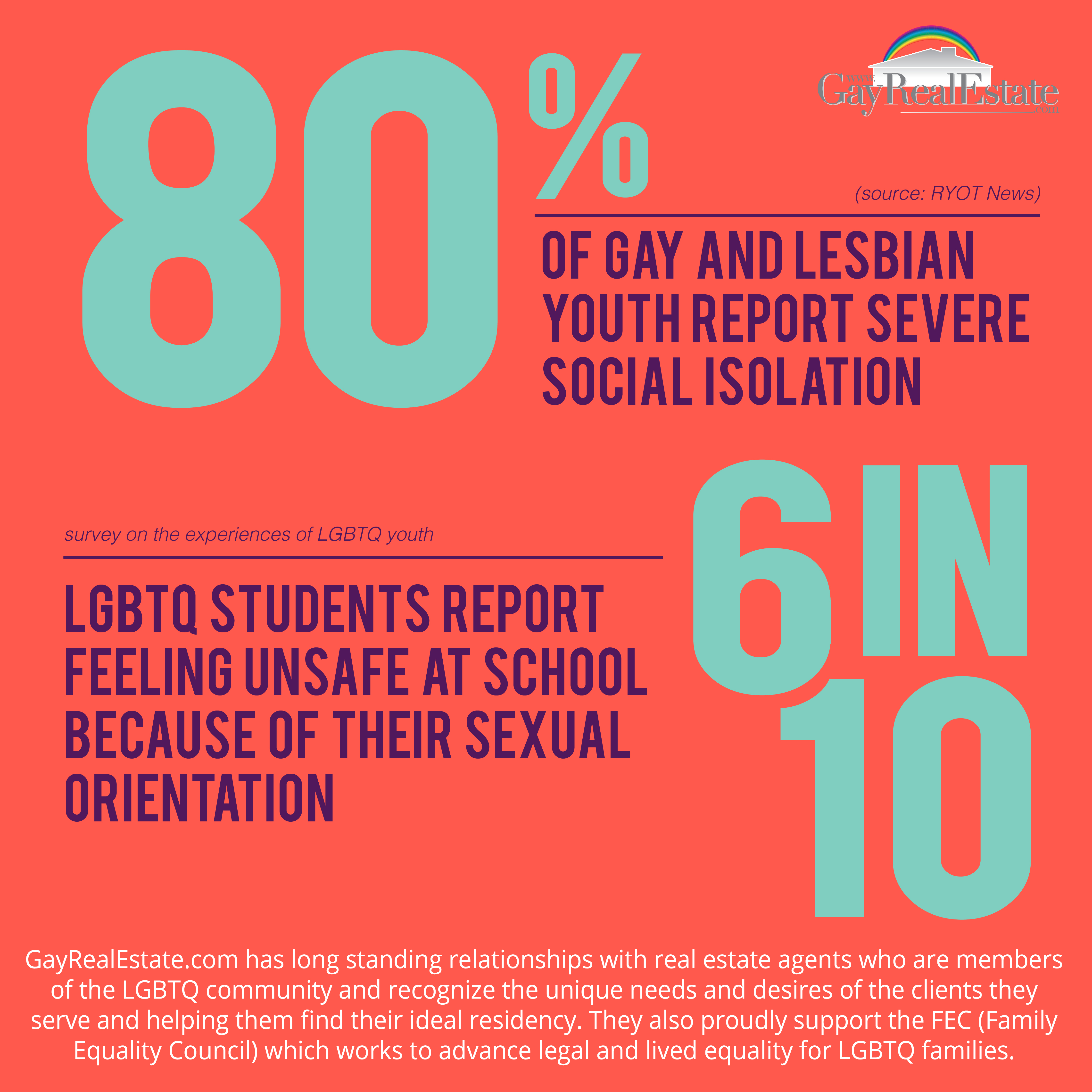 GayRealEstate.com professionals are members and supporters of the LGBTQ community and maintain knowledge and understanding of the unique struggles and concerns of the community, while supporting their clients with insight and resources specific to their needs. GayRealEstate.com proudly supports the Family Equality Council (FEC). FEC works to advance legal and lived equality for LGBTQ families and for those who wish to form them through building community, changing hearts and minds and driving policy change, according to their website.
