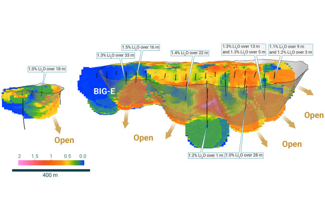 The MRE is based on 126 three-dimensional ("3D") pegmatite resource models, constructed in Leapfrog, representing the Big East, Big West, Fi Main, Fi SW, Nite, Shorty, Echo and Ki pegmatite deposits. Li2O grades were estimated for each mineralization domain using 1.0 metre composites. To generate grade within the blocks, the inverse distance squared (ID2) interpolation method was used for all deposits.