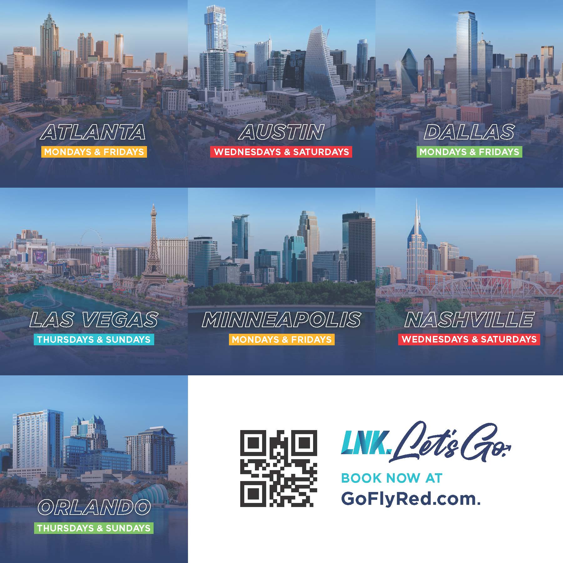 On March 30, seven new nonstop destinations from Lincoln were announced (Las Vegas, Orlando, Nashville, Austin, Minneapolis, Dallas, and Atlanta). Red Way said in a statement, "One of our core values is community. We knew based on research that these destinations would be popular, but we are astonished by the community's reception and response. We have received incredible messages of support as well as frequent suggestions on special dates and routes to add. We want customers to know we love to hear their suggestions and that we are receptive to them!"