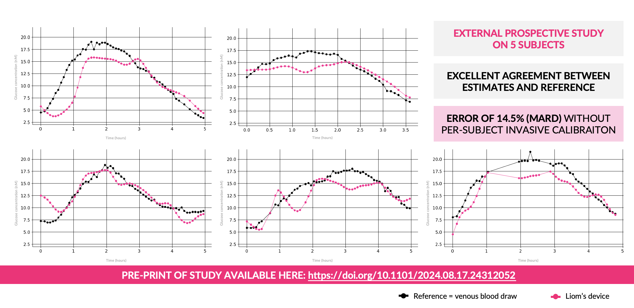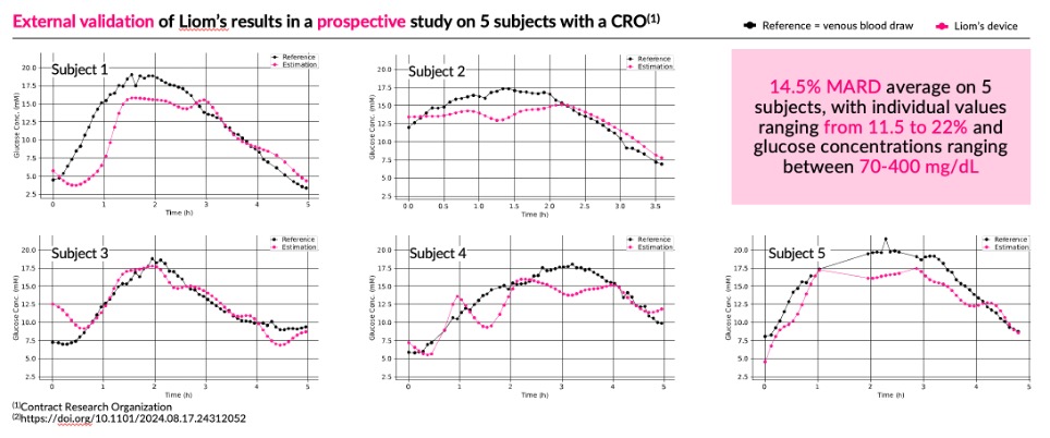 Online, December 3, 2024 (Newswire.com) - Liom has continued its technological progress: it is the first and only company to demonstrate accurate non-invasive glucose measurements without the need for invasive per-subject calibration using a needle. This puts Liom ahead of the deep-pocketed, established players in the wearable business, such as Apple, Samsung and Google, that so far were not able to share comparable results. Liom has repeatedly demonstrated this capability throughout 2024 in a number of internal and external studies, which ranged from 3-6 hours and were conducted on >60 subjects so far. In a recent third-party validation study (i.e., external and prospective), Liom's proprietary benchtop system and AI algorithms demonstrated a MARD (Mean Absolute Relative Difference) of 14.5% without any per-subject calibration (publication pre-print available via: https://doi.org/10.1101/2024.08.17.24312052). MARD is the percentage error to the reference measurement, which in this case is a catheter-derived venous measurement. The company's light-& AI-only measurements show excellent agreement with reference blood glucose values for a wide range of glucose levels and time series. Using per-subject calibration, the MARD attained was even lower, at 7%. This performance is comparable to the first generation of needle-based CGMs, which after 10 years of optimization, have gradually reached the 10% MARD level. Currently, these devices, predominantly sold by the two medtech giants Abbott and Dexcom, dominate the strongly growing continuous glucose monitoring (CGM) market of USD >10bn that is attempting expansion towards healthy consumers, despite requiring replacement of its needle-based technology every 10-14 days. Liom sees significant potential for further improvement of its performance in the near-term, enabled by its purely light- and AI-driven approach that allows for rapid iteration. Prof. Dr. Lutz Heinemann, Founder and former CEO of leading CRO Profil, comments on Liom's recent progress: "The combination of Liom's innovative approach, scientific depth, interdisciplinary team, and impressive results are unique. I look forward to Liom's progress towards a product with confidence and optimism!"