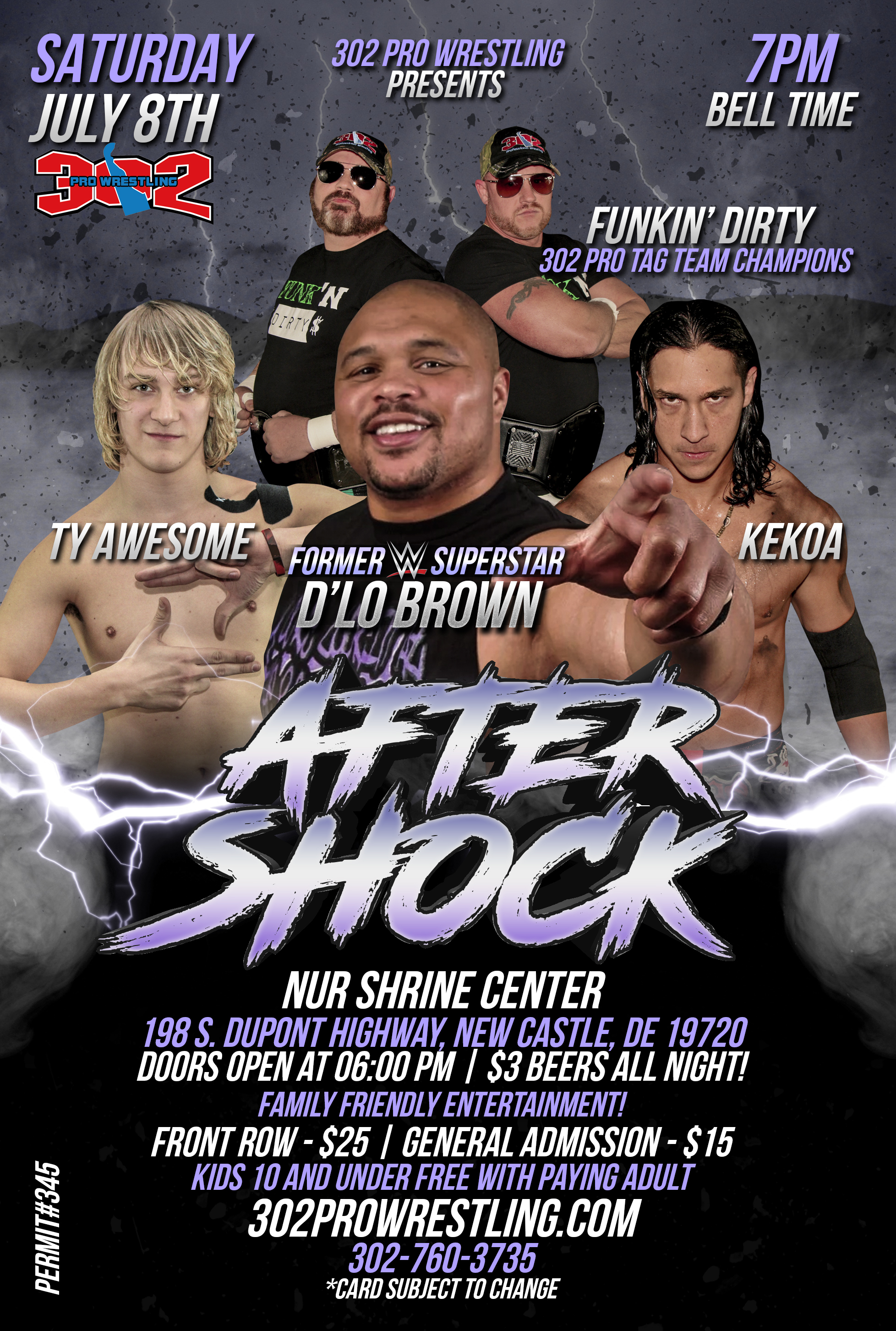 New Castle, Delaware, April 11, 2017 (Newswire.com) - 302 Pro Wrestling is proud to present “After Shock” Featuring Former WWE Superstar D'lo Brown. After shock is projected to be one of the largest family friendly professional wrestling events of the year. It will be held at 198 S DuPont Hwy in New Castle Delaware 19720, on July 8th, 2017. Doors open at 6:00 PM, and first match starts at 7:00PM. The event will feature high intensity, family friendly action. The event will offer a lot of food options and $3 beer options. Some of the featured wrestling stars include: Former WWE Star D'lo Brown, Franco Varga, Dirty Sonny Deeds, Travis Banks, Funky White Boy, TY Awesome and many more.